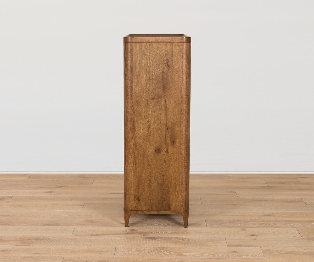 Crafted from solid oak with a beautiful dark finish, the mid-century Aden High Chest features a versatile design that’s rounded at the edges for a softer, sleeker look. Other enhancements include drawer pulls that pop in and out to maintain a minimalist profile, a unique lip around the top edge, and soft-close drawers and doors to protect fingers and contents. Mix and match it with other pieces in the Aden Collection to create a stylish, complementary set.