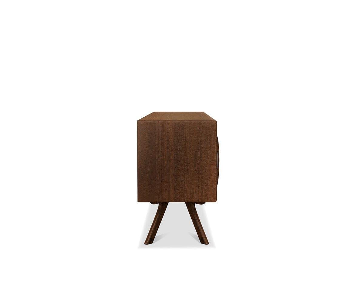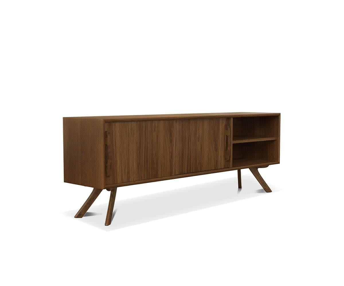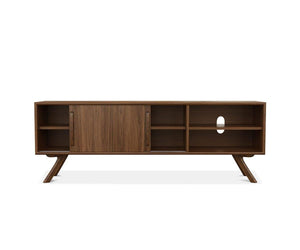 The Ardal Media Stand is a stylish mid-century blend of expressive form and useful function. Solid beech legs finished in a warm walnut stain feature sweeping mid-century angles that infuse any room with a sense of life and movement. The case itself comes with solid walnut handles and ample storage space: on one side of this piece two open cubbies complete with cord-organizing cutouts stand ready to store your various media equipment. On the other side of this media stand sliding doors offer you the opportunity to tuck away other living room or media necessities.