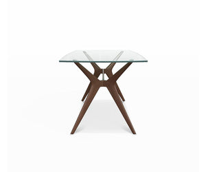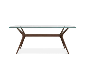 A stylish addition to any room, the design of the expressive Ardal Rectangular Dining Table helps to define any space it occupies by infusing it with a sense of life and movement. Showcasing a blend of warm mid-century wood tones and clean contemporary glass, this piece can be easily styled in a variety of settings. This dining table features sweeping legs with Mid-Century angles crafted from solid European beech wood; a thick rectangular glass top which gives an unobstructed view of the artistically angled legs.