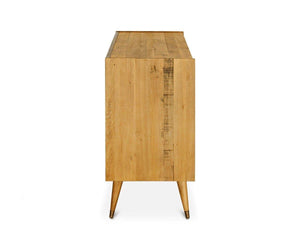 The epitome of Scandinavian design, the Bolig Double Dresser provides you with ample storage for your wardrobe with six large drawers that feature uniquely carved drawer pulls. This dresser is crafted from solid American poplar with a distressed finish and features gently angled, tapered legs with brass capped feet. The rustic reclaimed look of this collection is achieved through an intentional distressing technique that applies burn and saw marks to the surface while retaining and highlighting natural characteristics in the wood. This technique results in a reclaimed driftwood appearance, which adds personality and a one-of-a-kind uniqueness to each piece.