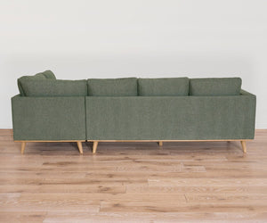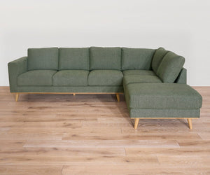 A true foundational piece, the Brielle Sectional brings a classic-cool design and pop of color that will add extra dimension to any decor style. Angled light wood legs complete the look, offering a sleek contrast with the green fabric while enhancing its modern aesthetic.