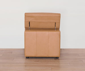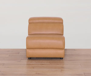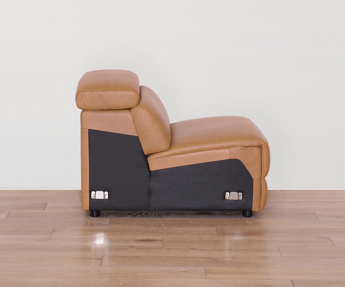 Designed for sink-in comfort and ultimate versatility, the modular Brix Collection lets you create a custom configuration for your space, while ultra-plush seating and buttery-soft leather in a buckskin hue enhance any setting. The armless chair is available in your choice of full-power recline or stationary model, both featuring a minimalist silhouette for maximum comfort without the bulk.