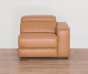 Designed for sink-in comfort and ultimate versatility, the modular Brix Collection lets you create a custom configuration for your space, while ultra-plush seating and buttery-soft leather in a buckskin hue enhance any setting. The recliner features a headrest and footrest that can be adjusted separately for personalized, ergonomic support—and a minimalist silhouette offers maximum comfort without the bulk.
