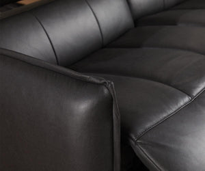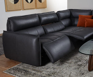 The contemporary Carson Power Motion sectional features a sleek design. Eye-catching channeling on the seat and back of this piece creates a modern look, while a softly curved arm with raised piping details mirrors the style of the comfortable headrests. This sectional has room for everyone: two side-by-side power seats with power headrests blend with a full corner and bumper end, creating a modern to-the-floor design with plenty of space for the whole family.Available for special order.