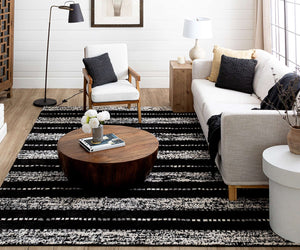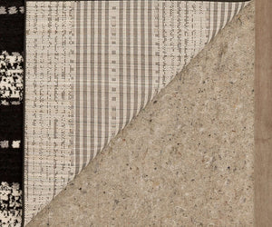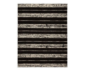 Machine-woven area rug with alternating striped and geometric patterns in charcoal.