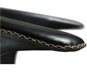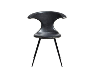 The Drake Chair is the perfect rustic industrial accent piece for your dining area. A comfortable round seat topped with uniquely curving arms echoes the classic western shape of a bullhorn. Upholstered in smooth faux leather, this chair is accented with contrasting stitching that speaks to rustic and modern Danish influences. A sturdy industrial frame features a matte black powder-coated finish, and legs that taper to subtly exaggerated points.