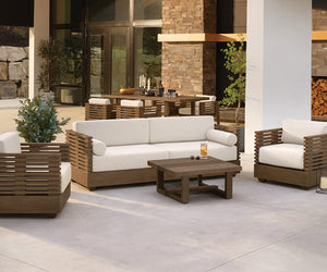 A slatted eucalyptus frame and plush, removable olefin cushions create an elegant framework for the Farren Outdoor Chair, while offering water- and UV-resistance for durability in all seasons. Pair this piece with other styles in the Farren Outdoor Collection to create the ultimate patio presence.