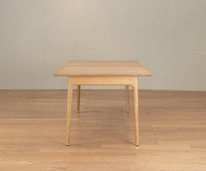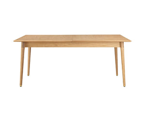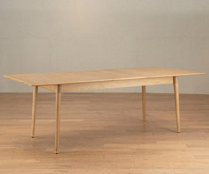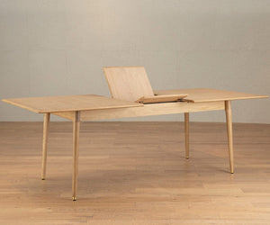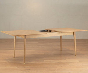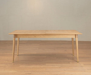 With its mid-century silhouette and unique storable leaf, the Hendrick Extension Dining Table in solid white oak brings versatility to both large and small spaces and can seat up to eight when fully extended. The rectangular shape and durable construction are ideal for family meals and friendly gatherings, while sleek tapered legs finished with brass caps add a classic touch.