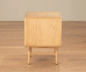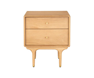 The Hendrick Nightstand in durable, solid white oak is designed with a classic mid-century aesthetic and a large surface to accommodate all your evening essentials. Two drawers offer additional storage capacity and help keep your space clutter-free, while brass door pulls and leg caps complete the look. The Hendrick Nightstand also makes a great end table, and can be mixed and matched with other Hendrick pieces to create a stylish, complementary set.