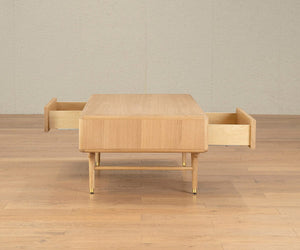 The Hendrick Storage Coffee Table in durable, solid white oak is designed with a classic mid-century aesthetic that works seamlessly with nearly any decor style. Two spacious storage areas—one drawer and one open cubby—keep essentials neatly stored, while the drawer features full-extension access and a metal ball-bearing glide for smooth opening and closing. Finally, brass drawer pulls and leg caps complete the look. Mix and match it with other pieces in the Hendrick Collection to create a stylish, complementary set.