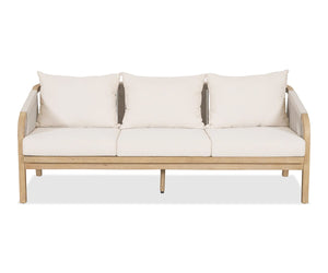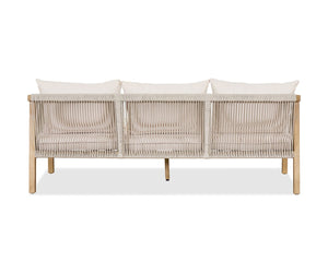 Gray rope accents add elegant texture to teak wood and plush cushions, giving the Iona Outdoor Sofa a refined, contemporary style. Naturally water- and UV-resistant, it pairs perfectly with other pieces in the Iona Outdoor Collection for a coordinated, contemporary display.