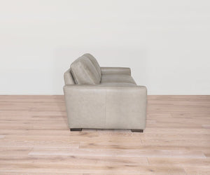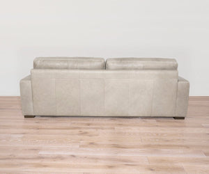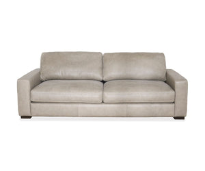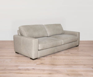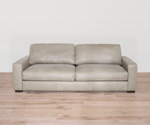 Top-grain leather in a fresh, neutral shade brightens any room with a modern-rustic vibe, while wood legs complete the look with a timeless touch.