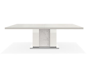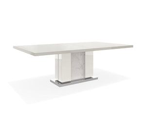 The striking Luciana Dining Table makes elegant dining easy with its contemporary pedestal design and thick table top. A high gloss finish and faux-marble accents elevate this style flawlessly, ensuring that your dining room stands ready to make a modern statement. Built to last a lifetime, the quality design and construction features a hidden extension leaf stored effortlessly under the pedestal table; simply slide the extra leaf out to seat the rest of your party in style.