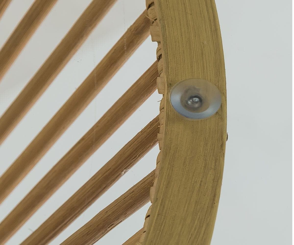 Round glass top with hourglass-shaped wicker base. Scandinavian-inspired minimalist design. Suitable for counter-height seating.