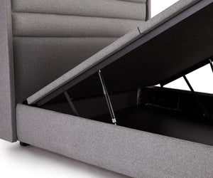 The Reed Bed is the perfect way to add style and ample storage to your bedroom. This bed features a fully upholstered frame with a curved footboard and well-cushioned, tufted headboard. Soft, textured fabric adds an air of cool modern style, while discreet wooden feet elevate this frame from the floor. The lift-up storage feature of this bed is by far its greatest asset: storage extends the entire length and width of the bed, granting you the space for everything from shoes to skis and more.