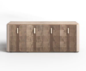 Elegant inlays, elongated handles and softly rounded edges give the Sancia Sideboard a distinct, contemporary style, beautifully anchored by a warm brown finish. Four doors offer plenty of room for your essentials, while the sophisticated aesthetic complements a variety of decor styles. Pair it with other pieces in the Sancia Collection for a coordinated look.