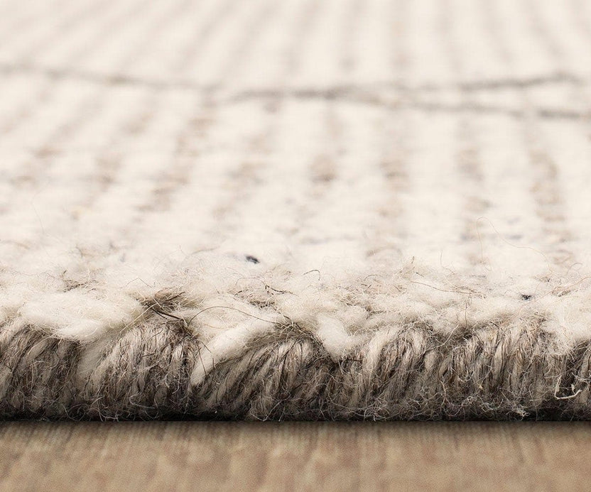 Hand-loomed runner rug with tribal diamond geometric pattern in neutral silver tones. Soft underfoot texture.