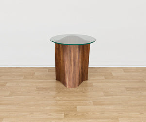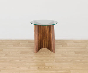 Featuring a striking, sculptural base handcrafted from suar wood and topped with tempered glass, the Spira End Table is the perfect accent for any design-forward decor style.