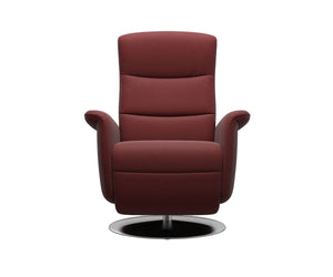 Sit, recline or rock comfortably in the Mike Power Chair by Stressless®. Featuring a slim profile with soft, rounded lines and a steel moon base, this contemporary design is ready to help you relax in true comfort. Individually adjust the headrest, backrest and footrest of this chair with the simple touch of a button. Enjoy 360 degree swiveling mobility and welcome lumbar support as you rest easily on padded cushioning upholstered in luxurious top-grain leather. Special order options available.