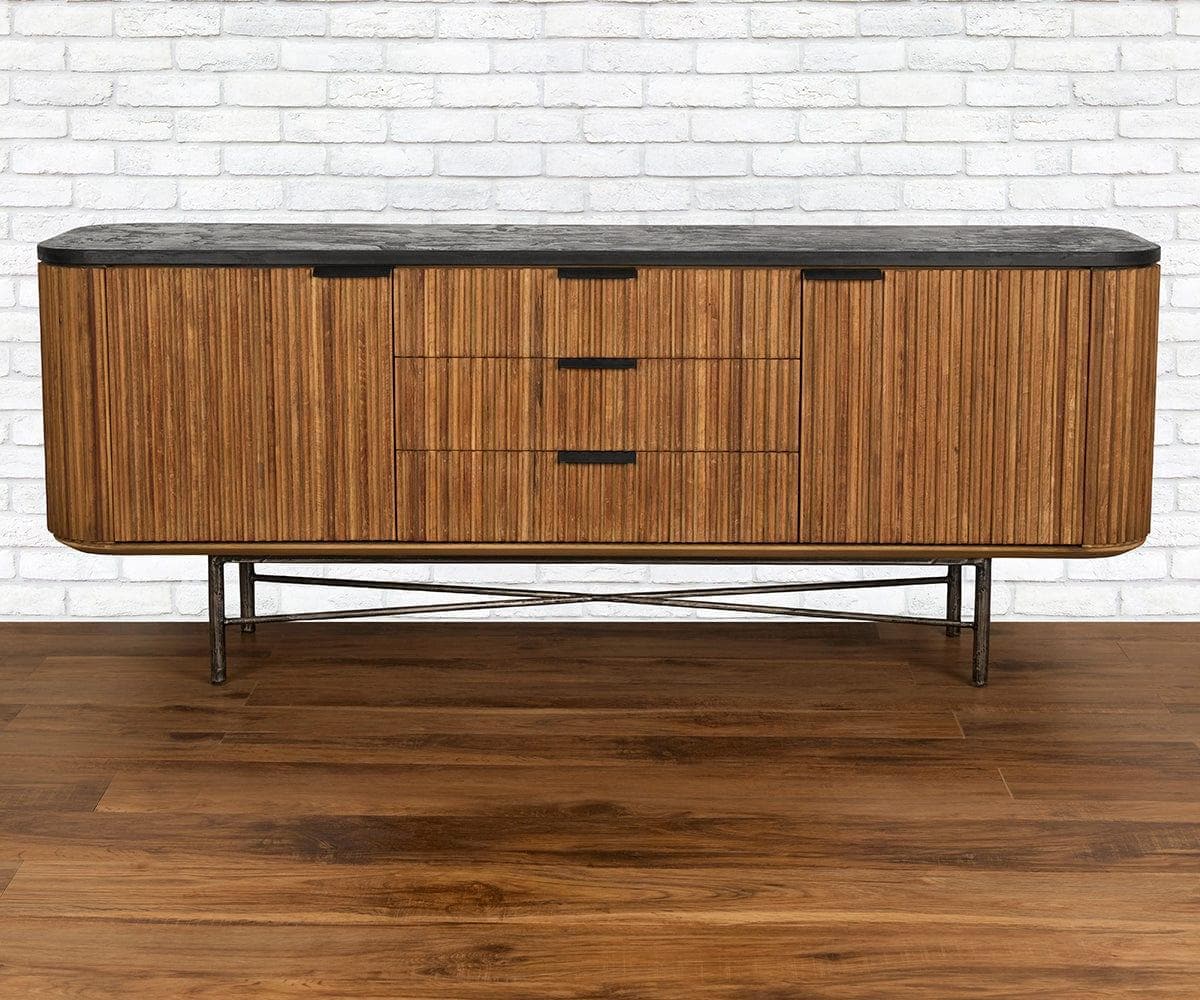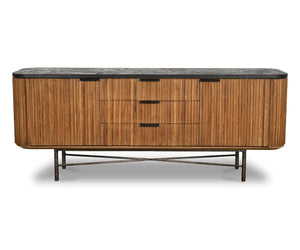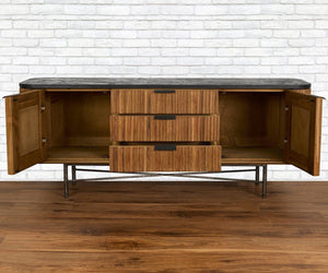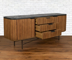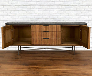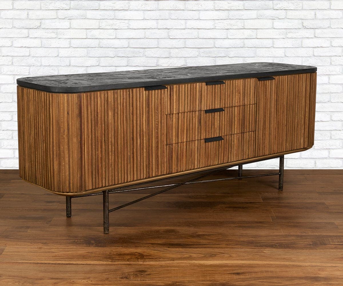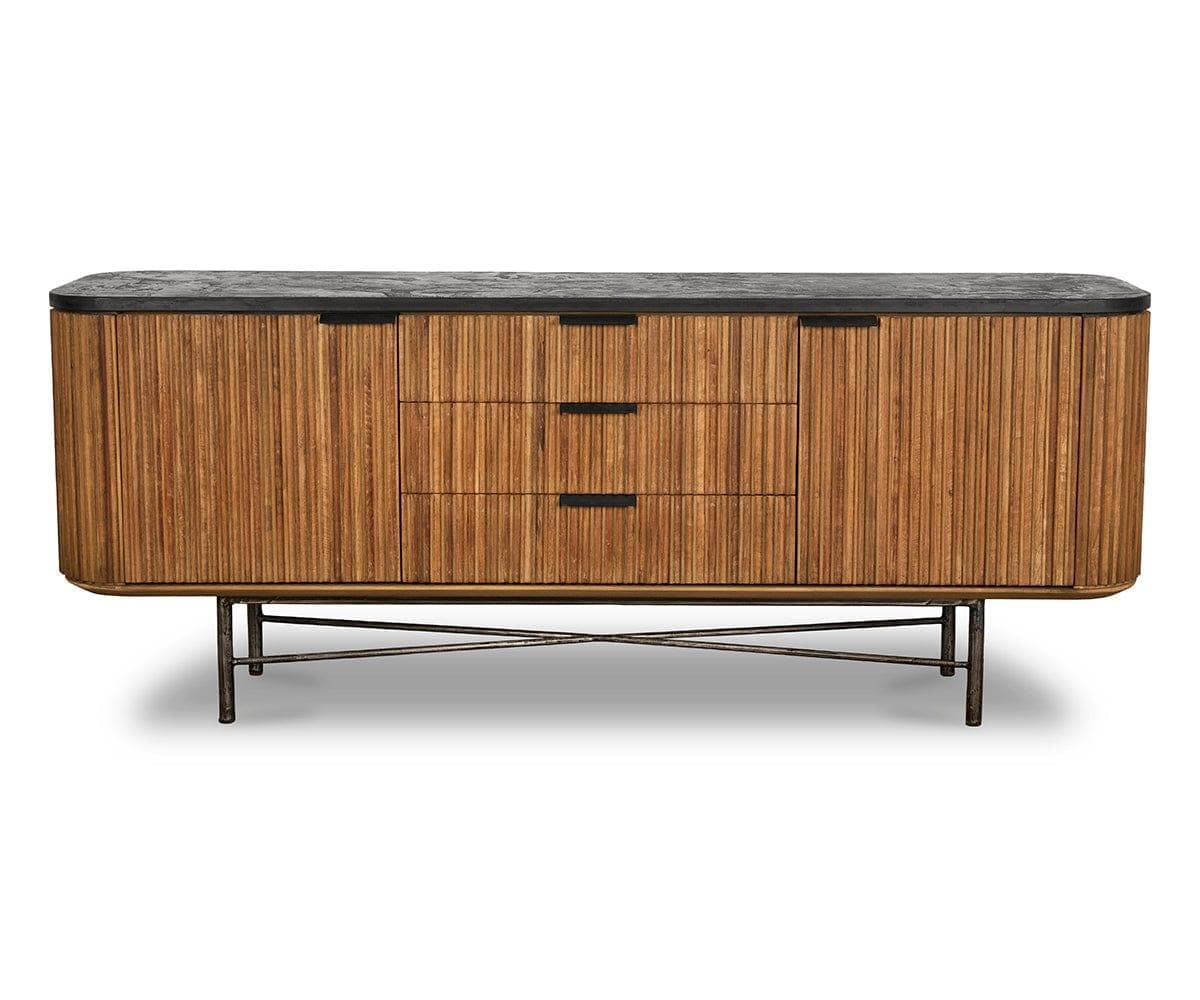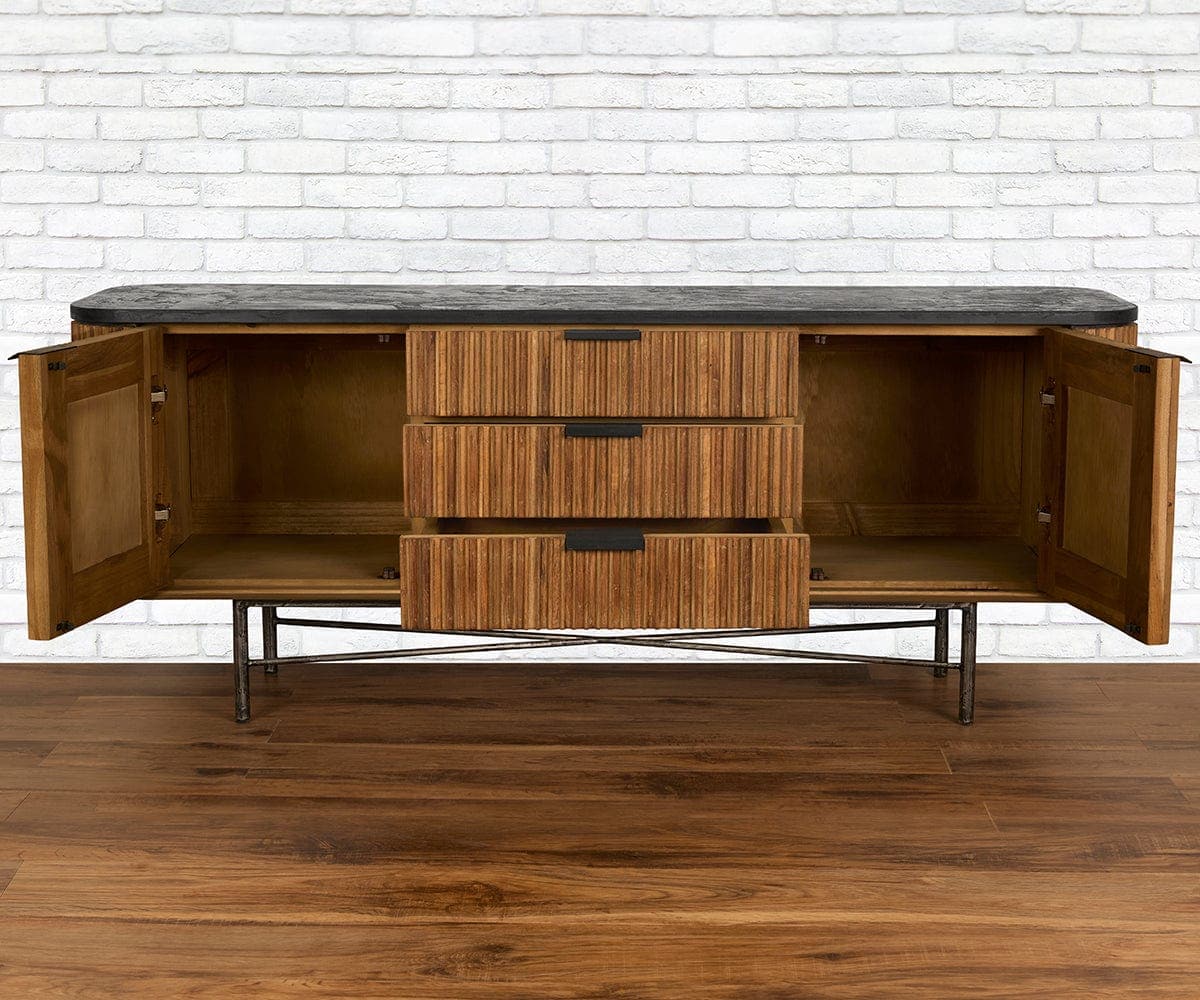 With a fluted, reclaimed teak base and matte black top, the Taavi Media Stand brings unmistakable panache to classic mid-century modern form. Two doors—each concealing a spacious compartment—and three drawers keep your essentials organized, while the textured Mortex top is heat resistant and easy to clean, so it’s ready for the rigors of everyday life. Please avoid leaving a pot with moisture directly on the tabletop for extended periods of time or use a trivet or other protective barrier. Black metal legs and accents finish the look and add depth and dimension to the durable teak. Be sure to pair it with other pieces in the Taavi Collection for a versatile look that’s both modern and timeless.
