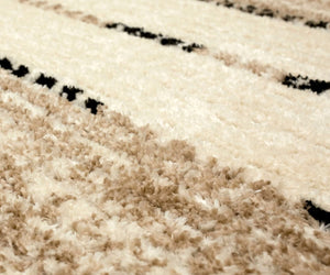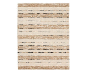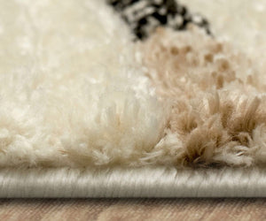 Machine-woven area rug with abstract pattern in tan and neutral tones.