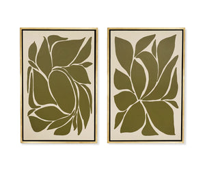 Layers of acrylic are hand-painted to create a dynamic floral motif, then mounted on a wooden frame embellished with gold leaf detailing. Set of 2 prints.