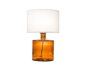The Translucent Glass Lamp features a clear base crafted from recycled glass. The organic shape of the base lends this piece an airy sense of biotic elegance. This lamp is topped by a classic fabric shade, which helps to soften the light and bring a sense of warmth to your space.