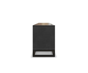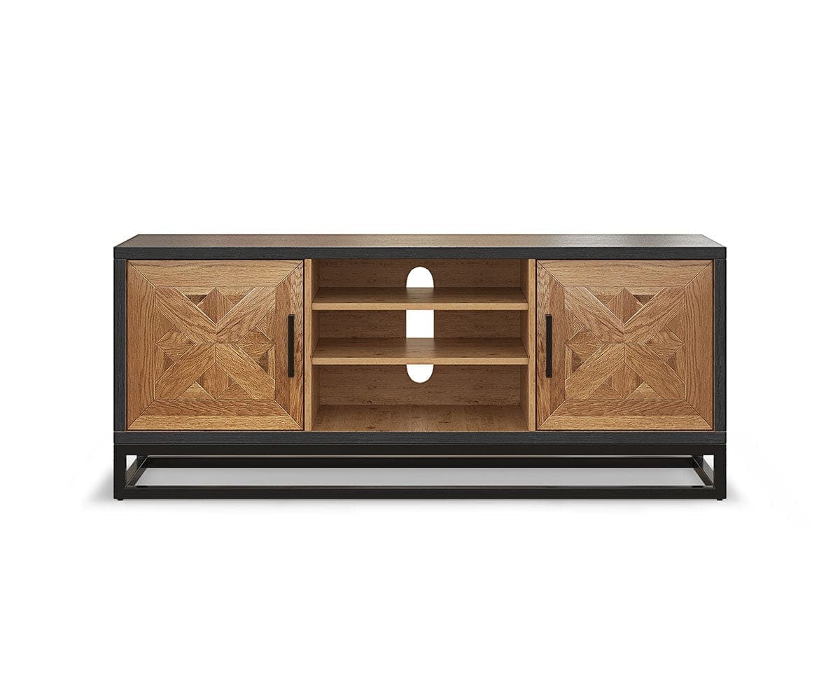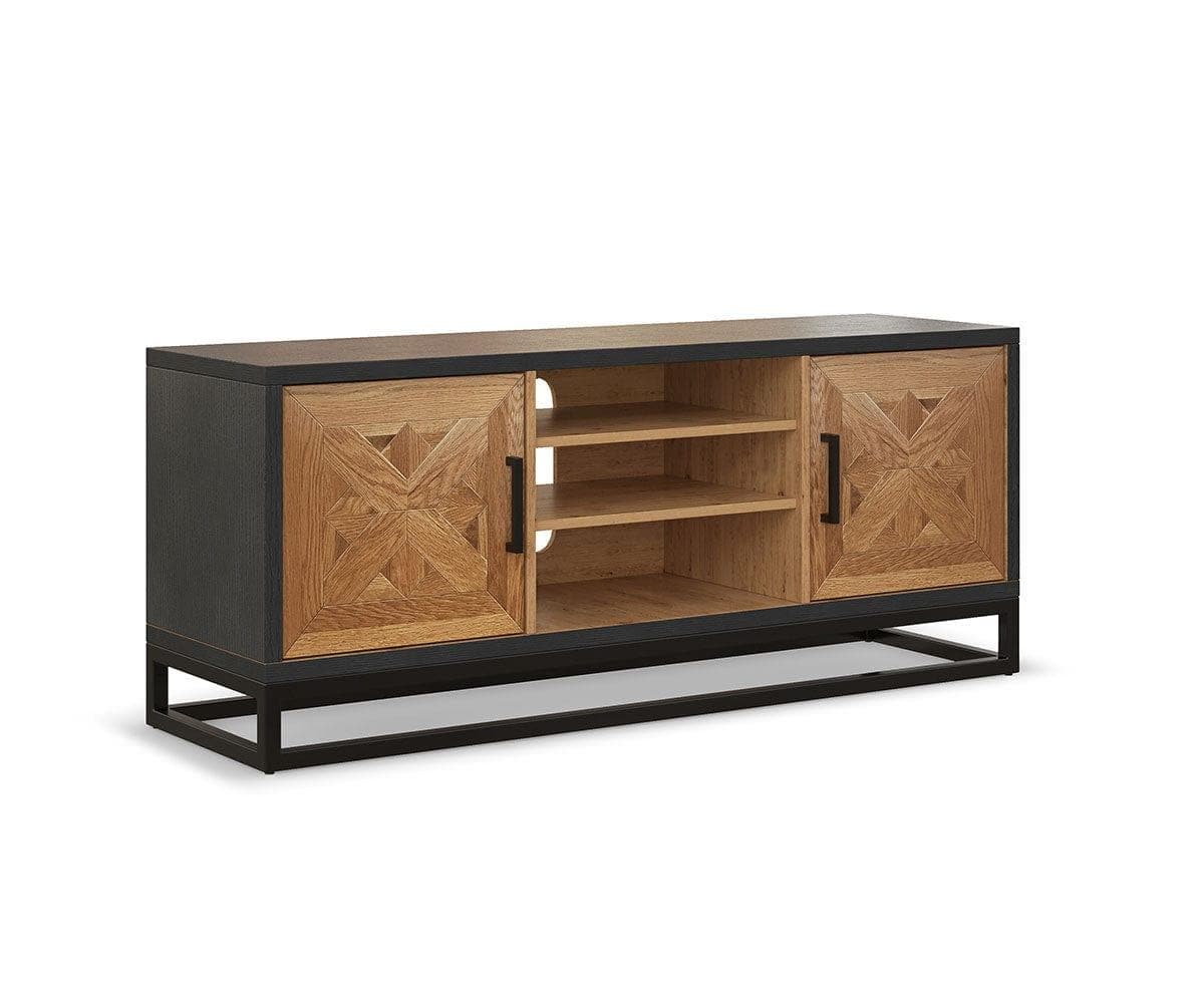 Store your media in style in the West Media Stand. This media stand comes with convenient cord-organizing cutouts and offers ample storage for all your living room and media necessities. The light wood cabinet fronts feature a rustic parquet pattern complete with inlaid details. Dark wood frames this design beautifully, and industrial metal legs with precise angles support the entire piece. The West Collection infuses your space with a touch of rustic industrial style; wood meets powder-coated metal for a look that combines warm, homey wood hues and striking modern metal.