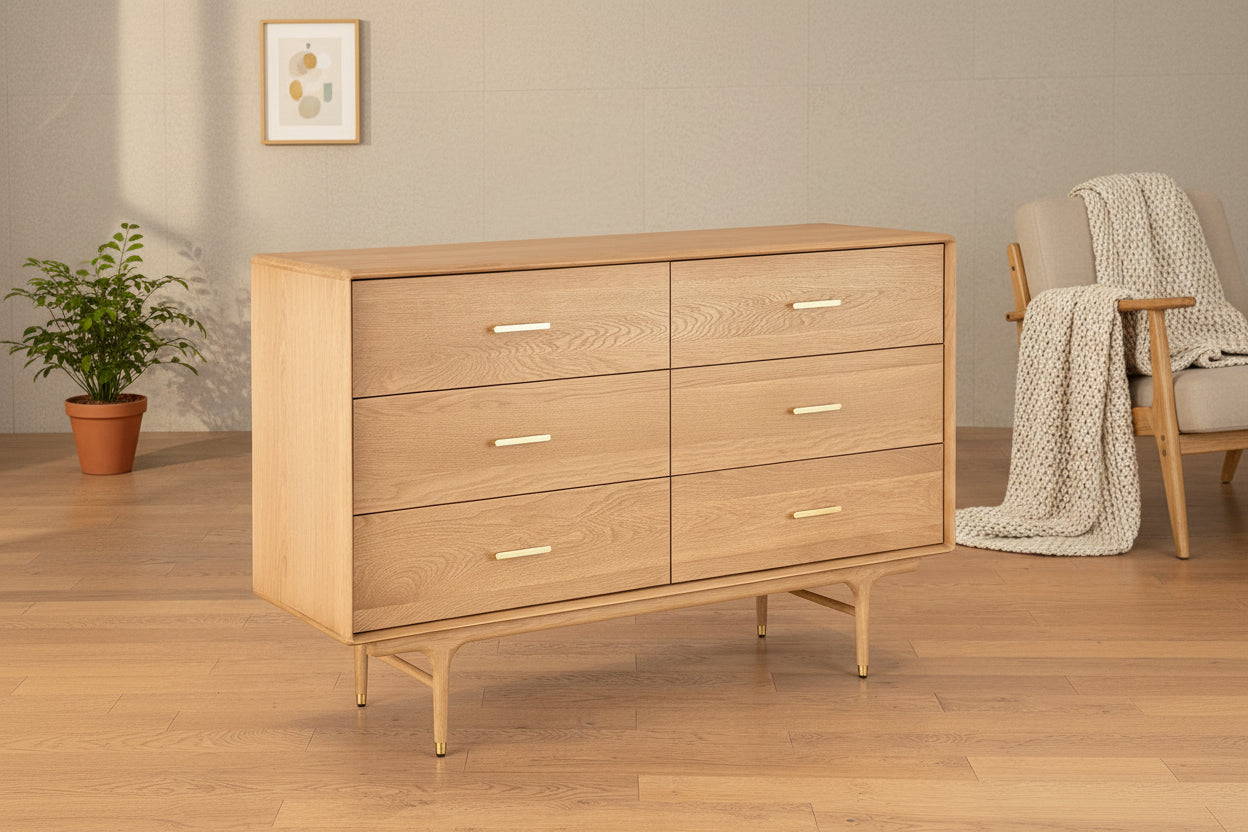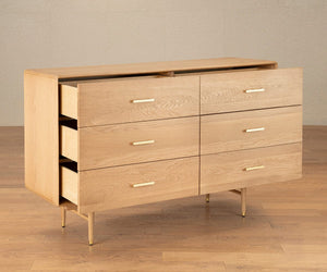 Solid white oak construction with six large drawers featuring full-extension metal glides. Brass handles and leg caps accent the mid-century design. Ideal for bedroom storage.